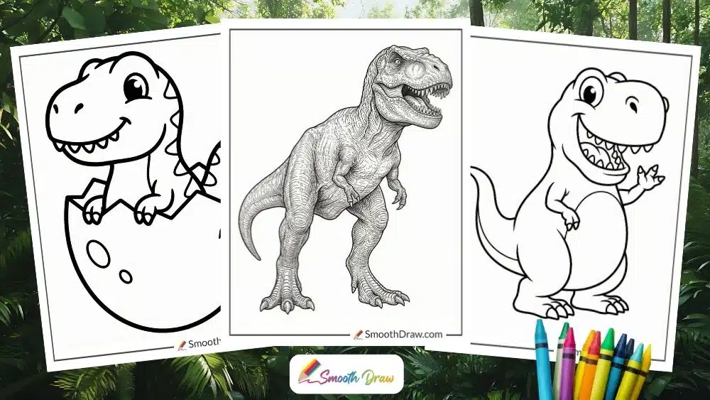 After coloring your favorite T-Rex designs, turn them into a dinosaur-themed art gallery. Use colorful washi tape or small picture frames to hang them on your bedroom wall or classroom board. Try arranging them in a “T-Rex timeline” showing baby to adult dinosaurs or different scenes like jungle, volcano, and desert. It’s a fun way to decorate your space and proudly display your artwork!